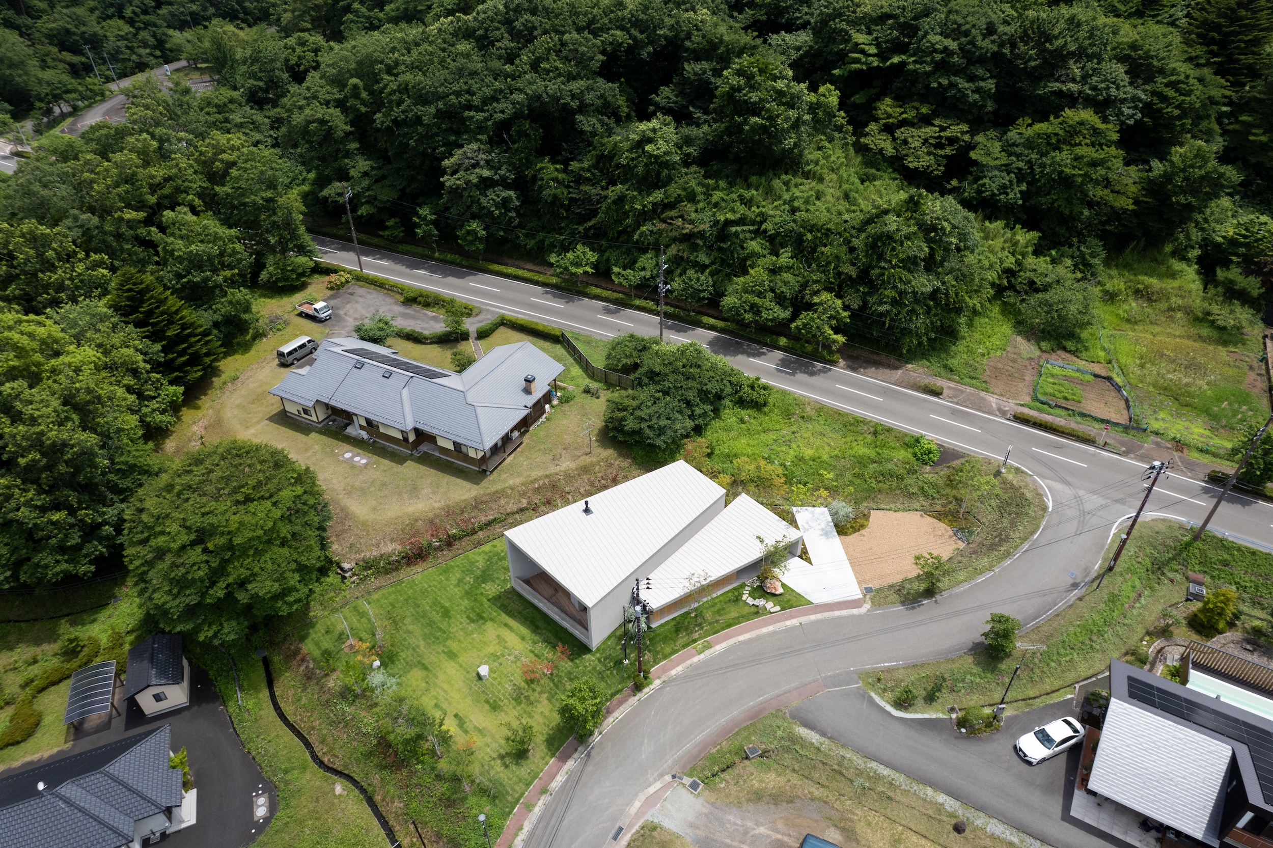 敷地はやわらかな曲線を描く不整形地で、北へ向かってゆるやかに傾斜し、南側には深い森が広がる。周囲には適度な距離で家々が点在し、土地の持つおおらかさが暮らしの背景を形づくっている。