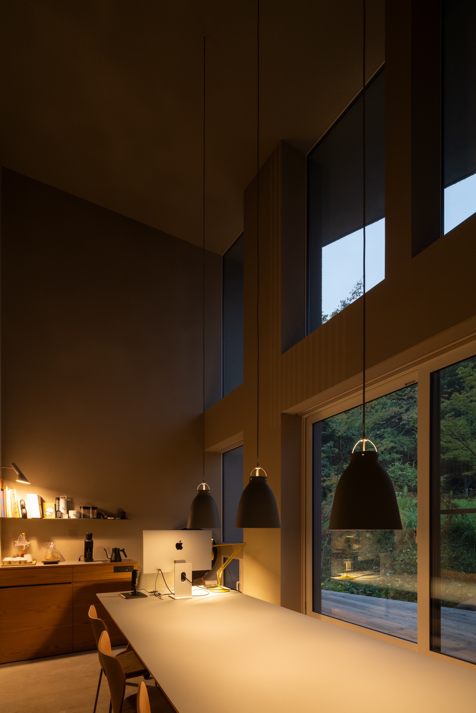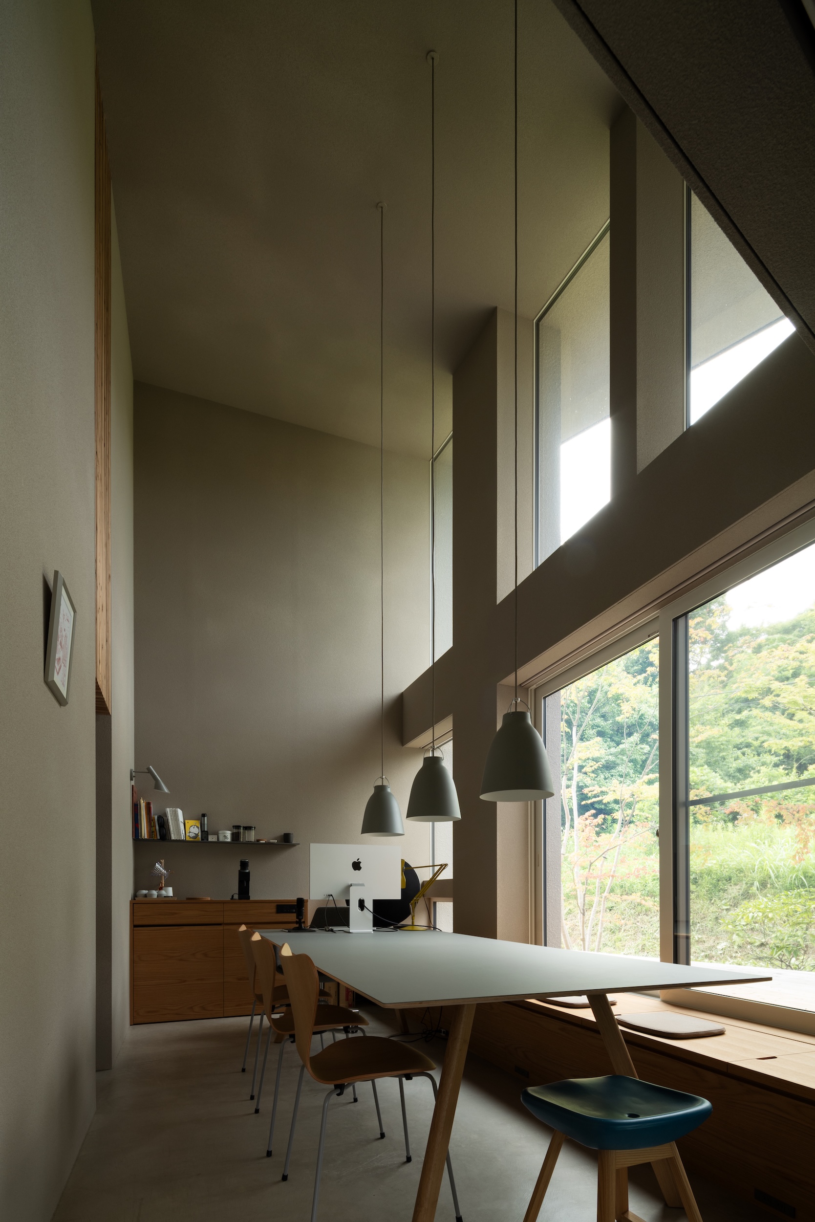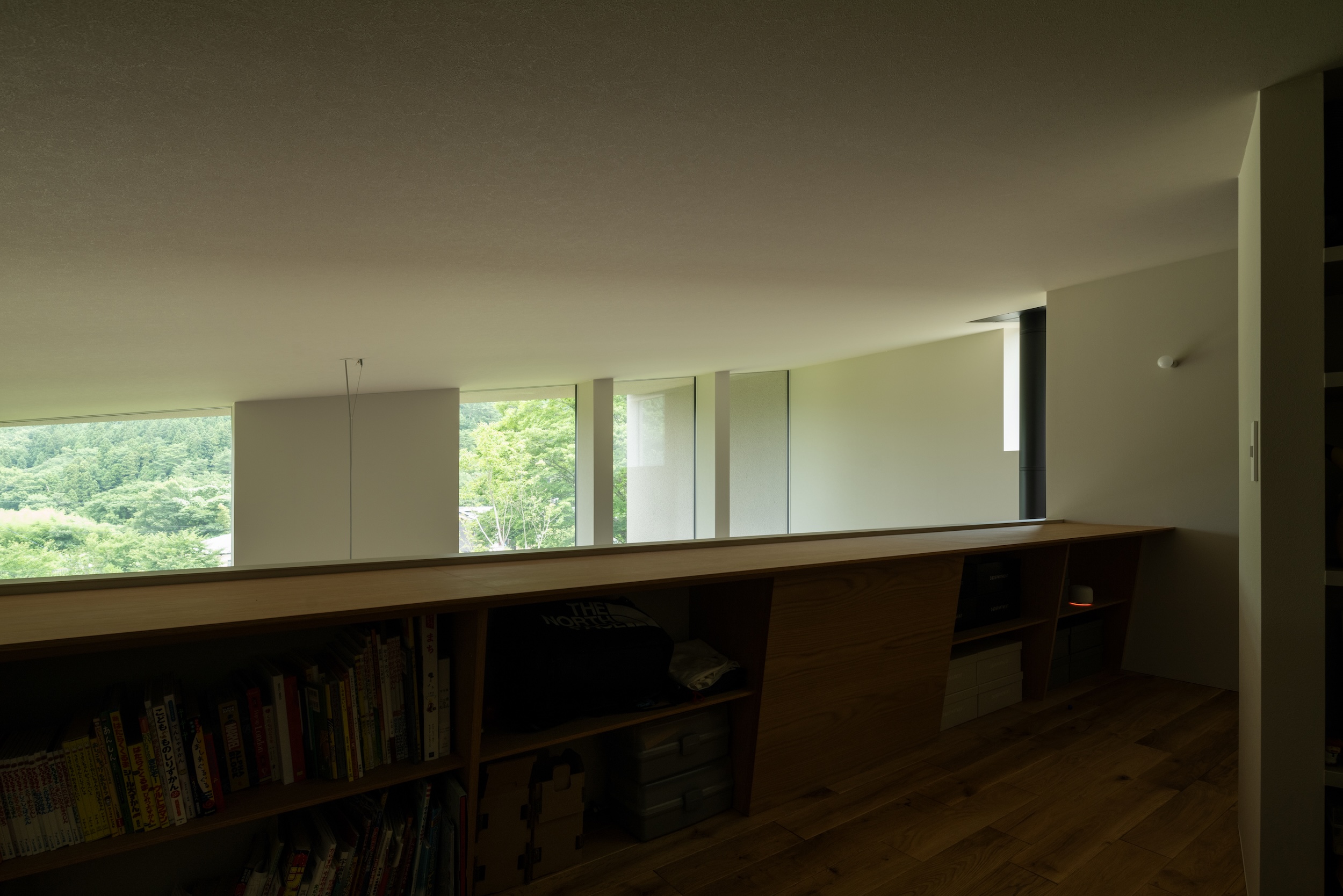 A built-in bench along the full-height windows allows one to relax and enjoy the forest view beyond, while a combination of fixed and operable windows ensures comfortable ventilation.