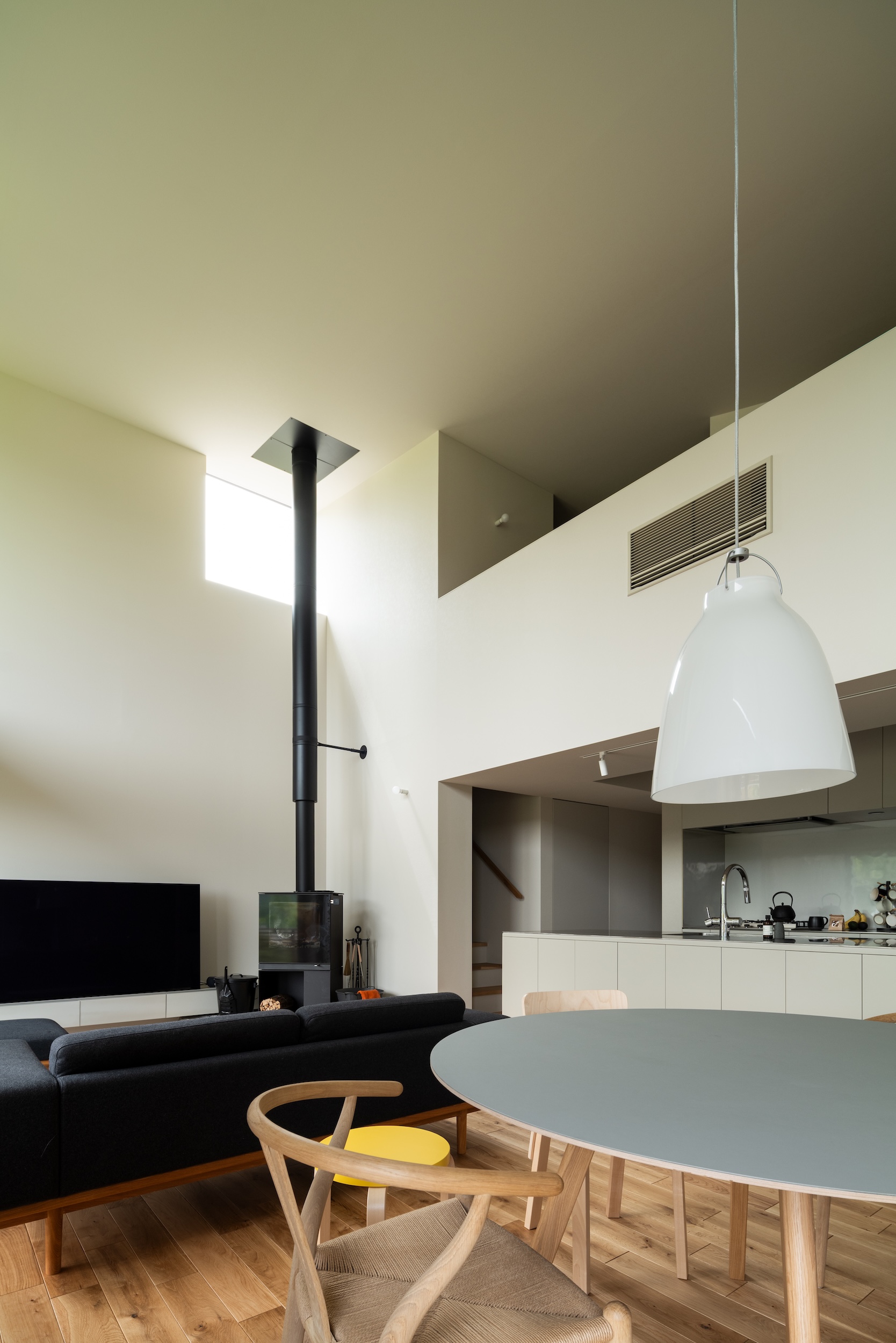 At the center of the house is a spacious, double-height living–dining–kitchen area.