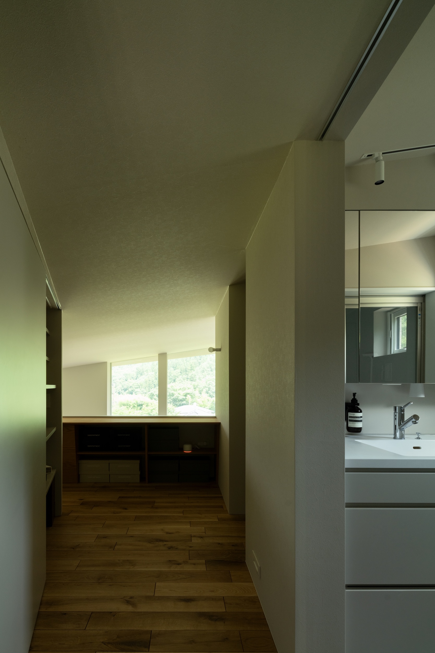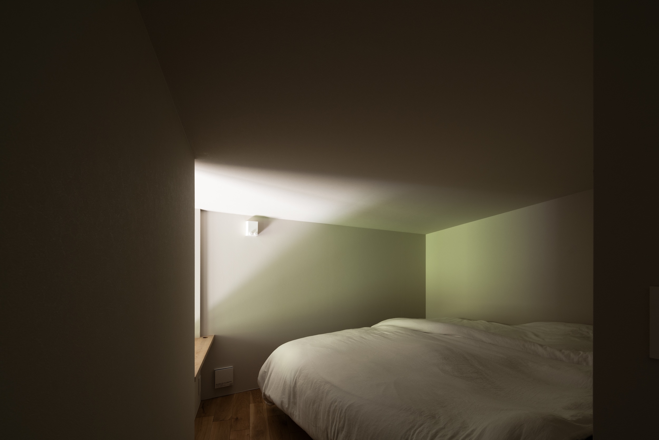 2階は天井の傾斜を生かして空間に変化をつけ、南北の通風を確保。収納棚でゆるやかに仕切られた寝室には、北側の大開口からやわらかな光が差し込み、静かな落ち着きを生んでいる。