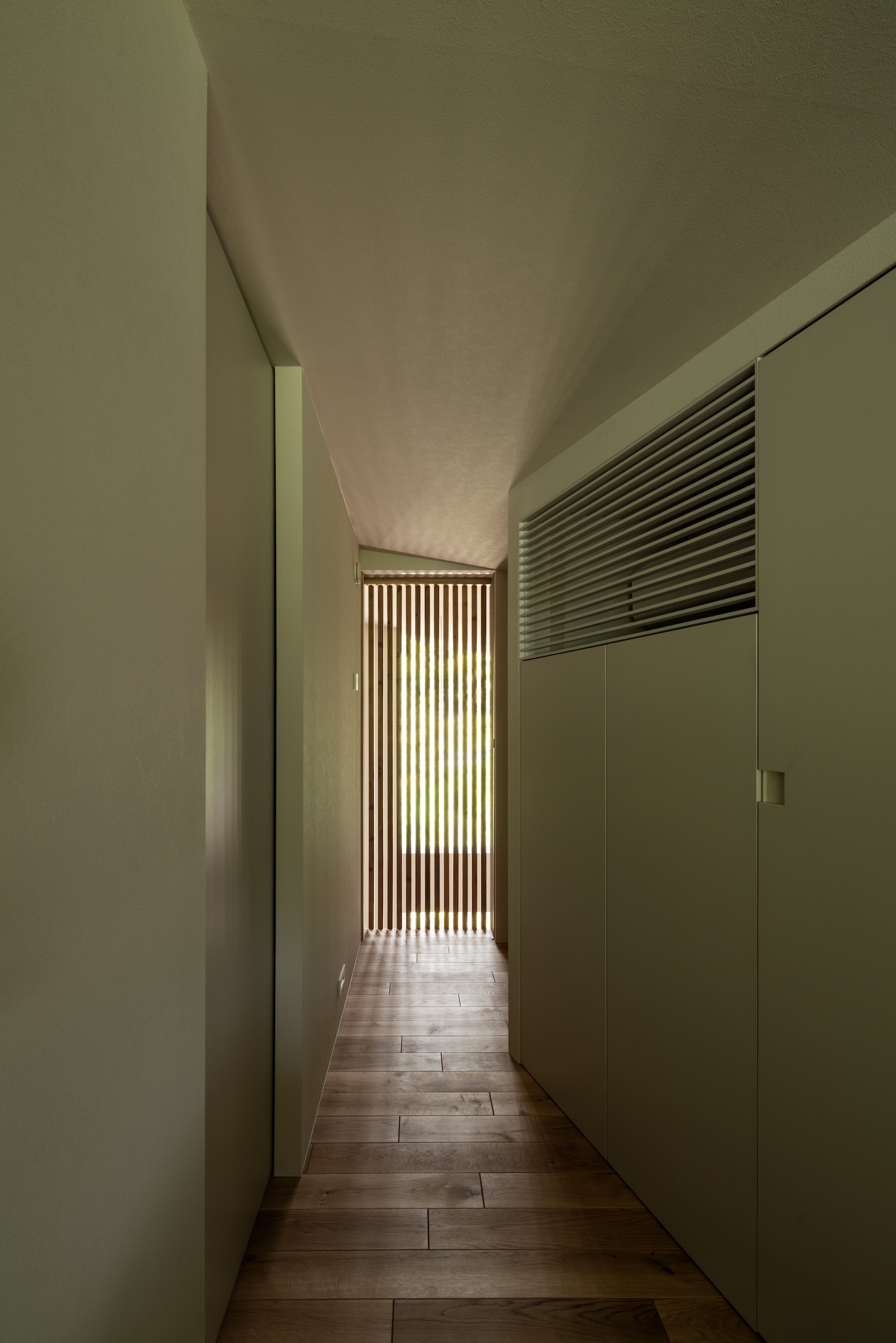 The second floor makes use of the sloped ceiling to create spatial variety and ensure cross-ventilation from north to south.