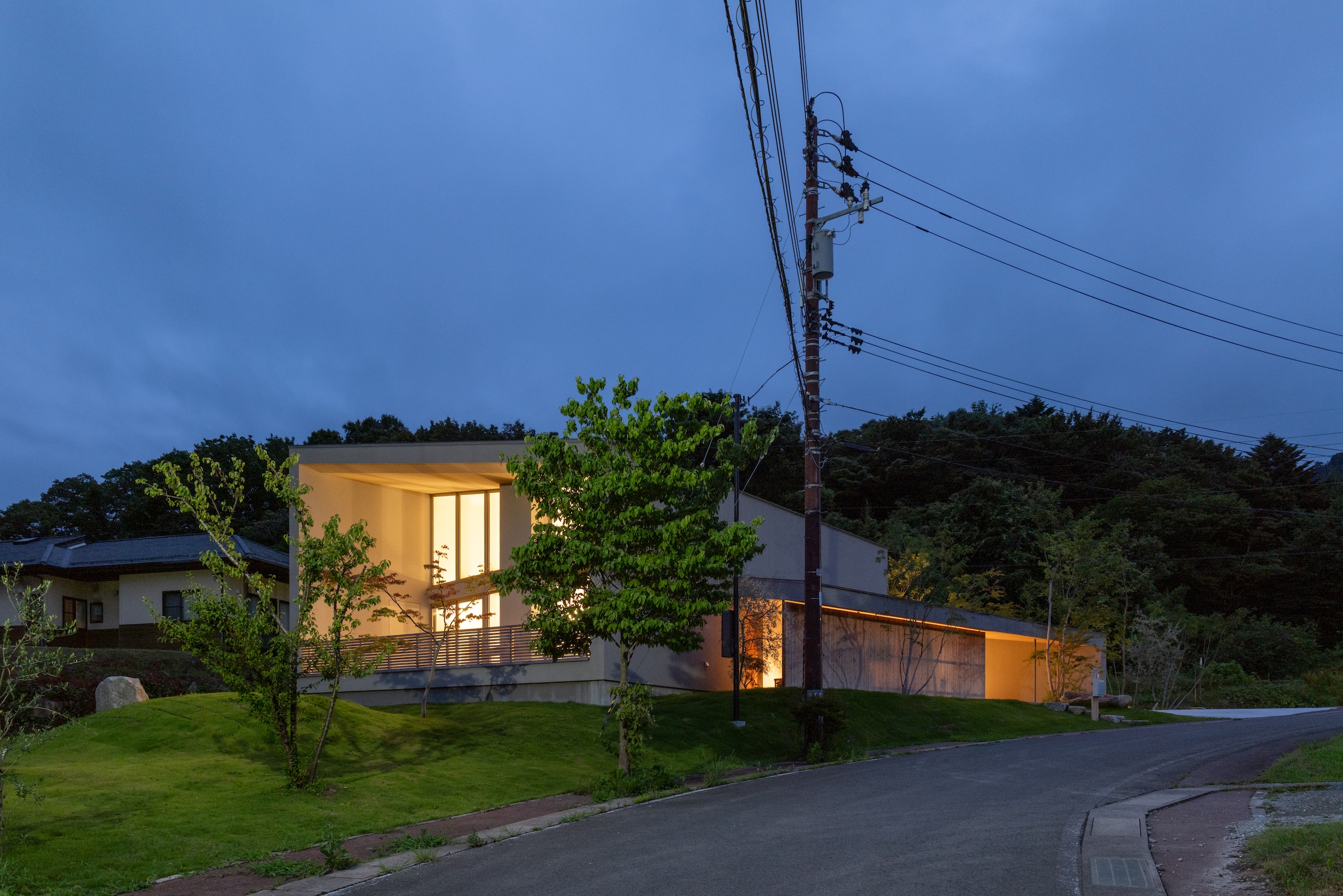 About fifteen minutes by car from the town center, House in Marumori stands on a gentle hillside within a residential area developed on undulating terrain.